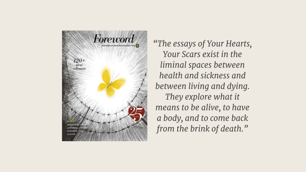 Illustrating the complex experience of organ transplantation and chronic illness, the essays of Your Hearts, Your Scars exist in the liminal spaces between health and sickness and between living and dying. They explore what it means to be alive, to have a body, and to come back from the brink of death.